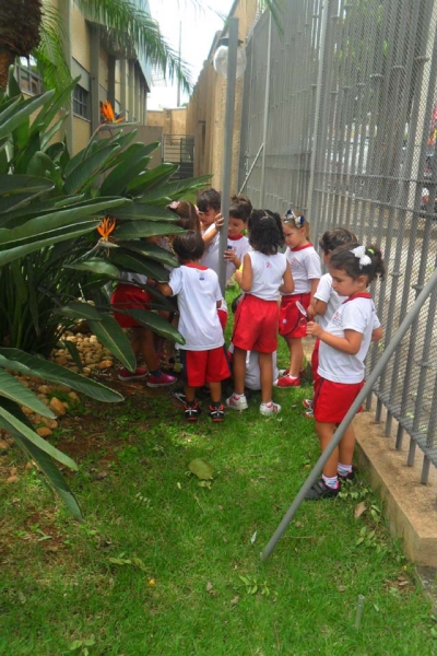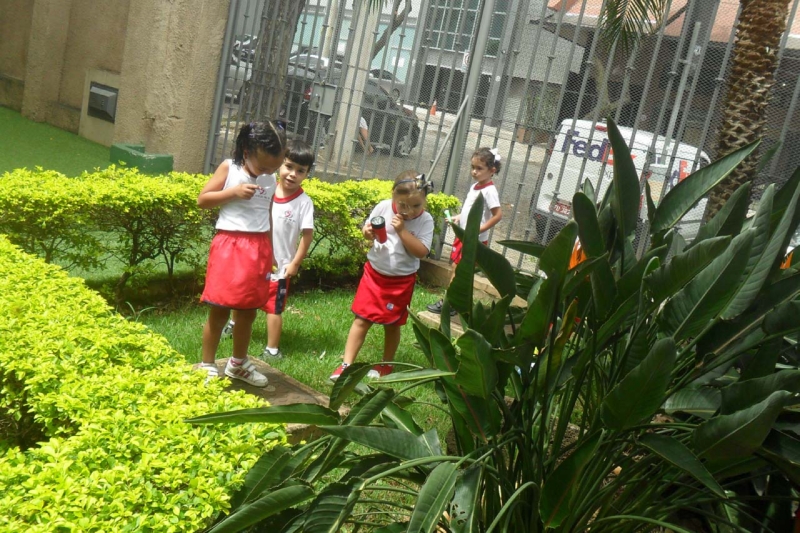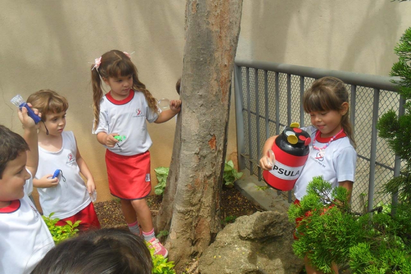 Com uma lupa e uma lanterna, os estudantes do Infantil II realizaram uma atividade inédita: encontraram no jardim do Colégio uma Cápsula do Tempo com cartas, músicas, estilos de roupas, fotos e recordações de Chiquinha Gonzaga.
