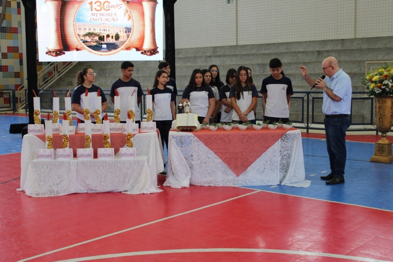 Após as homenagens, a comunidade se reuniu na área vermelha da escola para cantar os parabéns e celebrar com o bolo comemorativo de 130 anos, em um momento de alegria e confraternização.