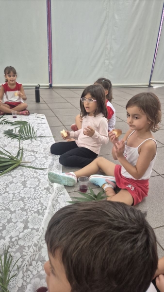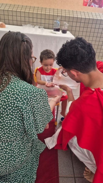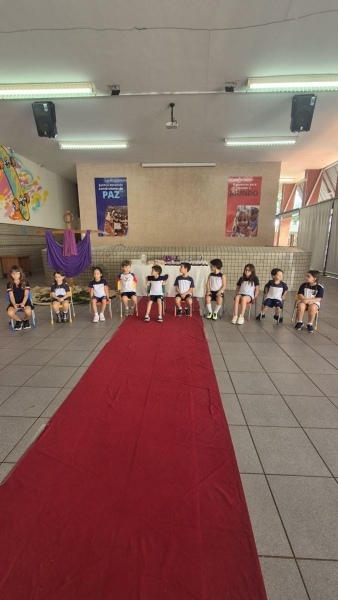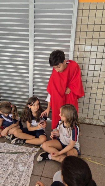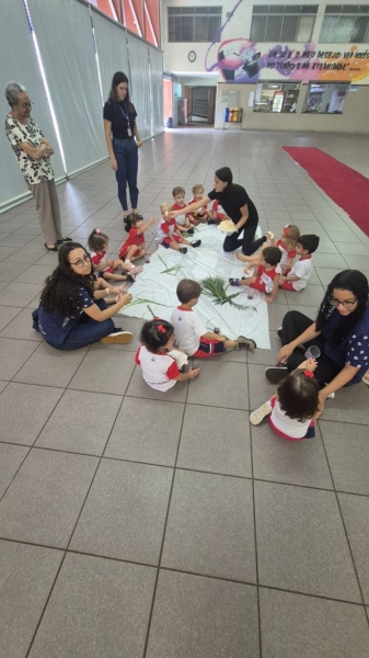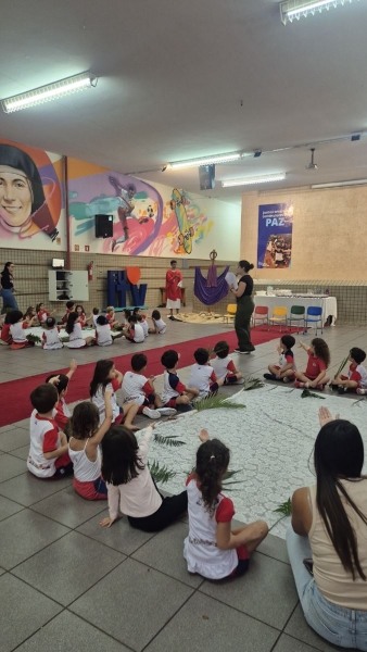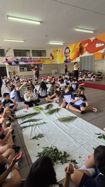 A programação teve início na segunda-feira (30), com encontros voltados à Educação Infantil e aos estudantes dos 1º anos. No período da manhã, as crianças participaram de uma vivência na área coberta da escola, marcada por momentos de oração, escuta e gestos simbólicos que ajudaram a apresentar, de maneira lúdica, o significado da Semana Santa.