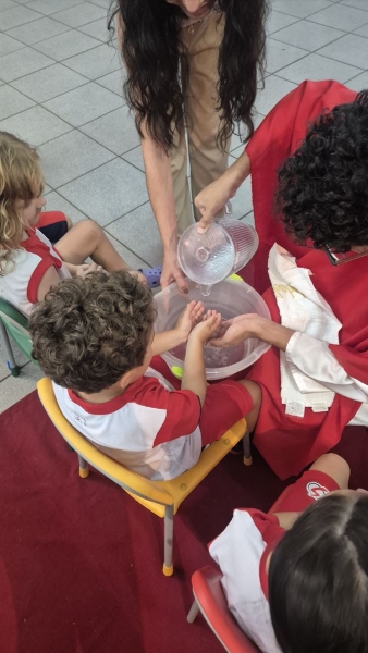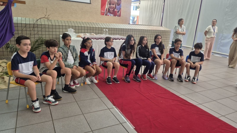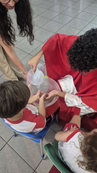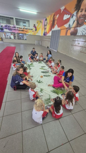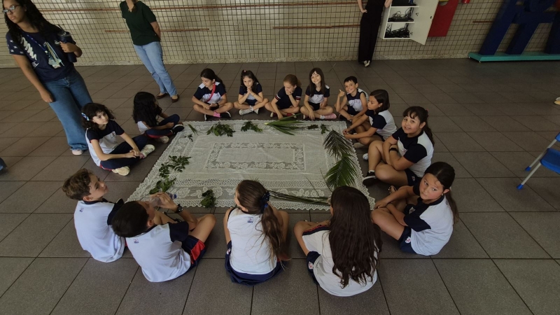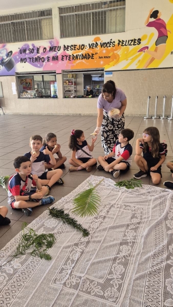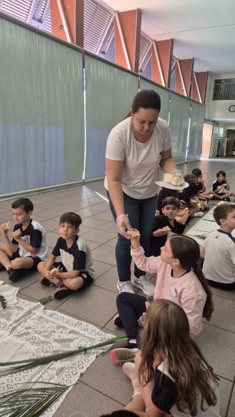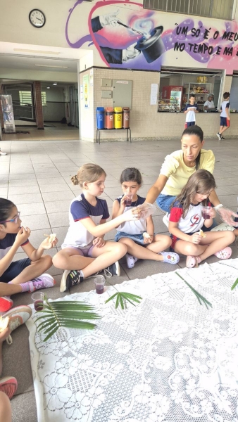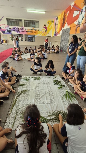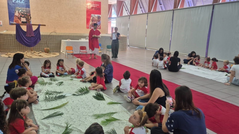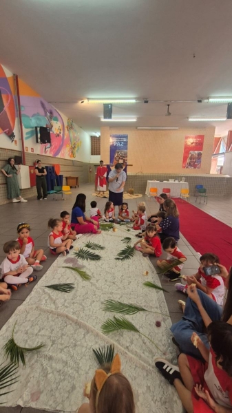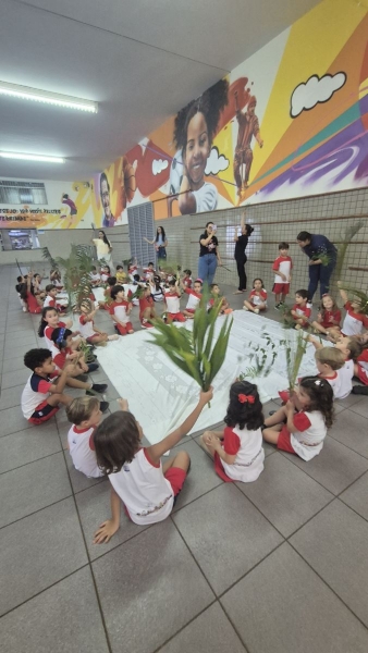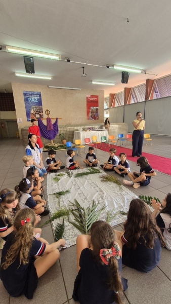 A programação teve início na segunda-feira (30), com encontros voltados à Educação Infantil e aos estudantes dos 1º anos. No período da manhã, as crianças participaram de uma vivência na área coberta da escola, marcada por momentos de oração, escuta e gestos simbólicos que ajudaram a apresentar, de maneira lúdica, o significado da Semana Santa.