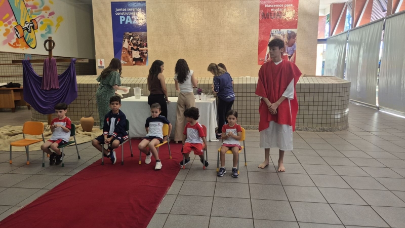 Durante esses momentos, a música “A Semana Santa Começou” acompanhou as atividades com as turmas menores, contribuindo para o clima de acolhida e espiritualidade vivenciado pelos estudantes.